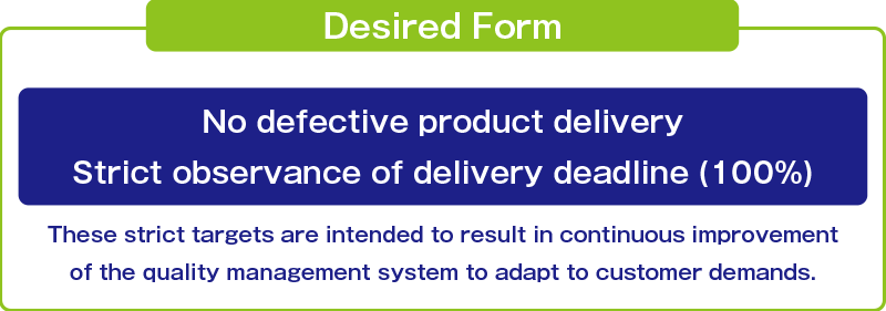 In order to attain the required quality based on our policy and desired form, not to mention strict observance of legal requirements, we set annual targets and management policy based on “policy management regulations” and expand it to all departments so it can be understood by the entire staff.