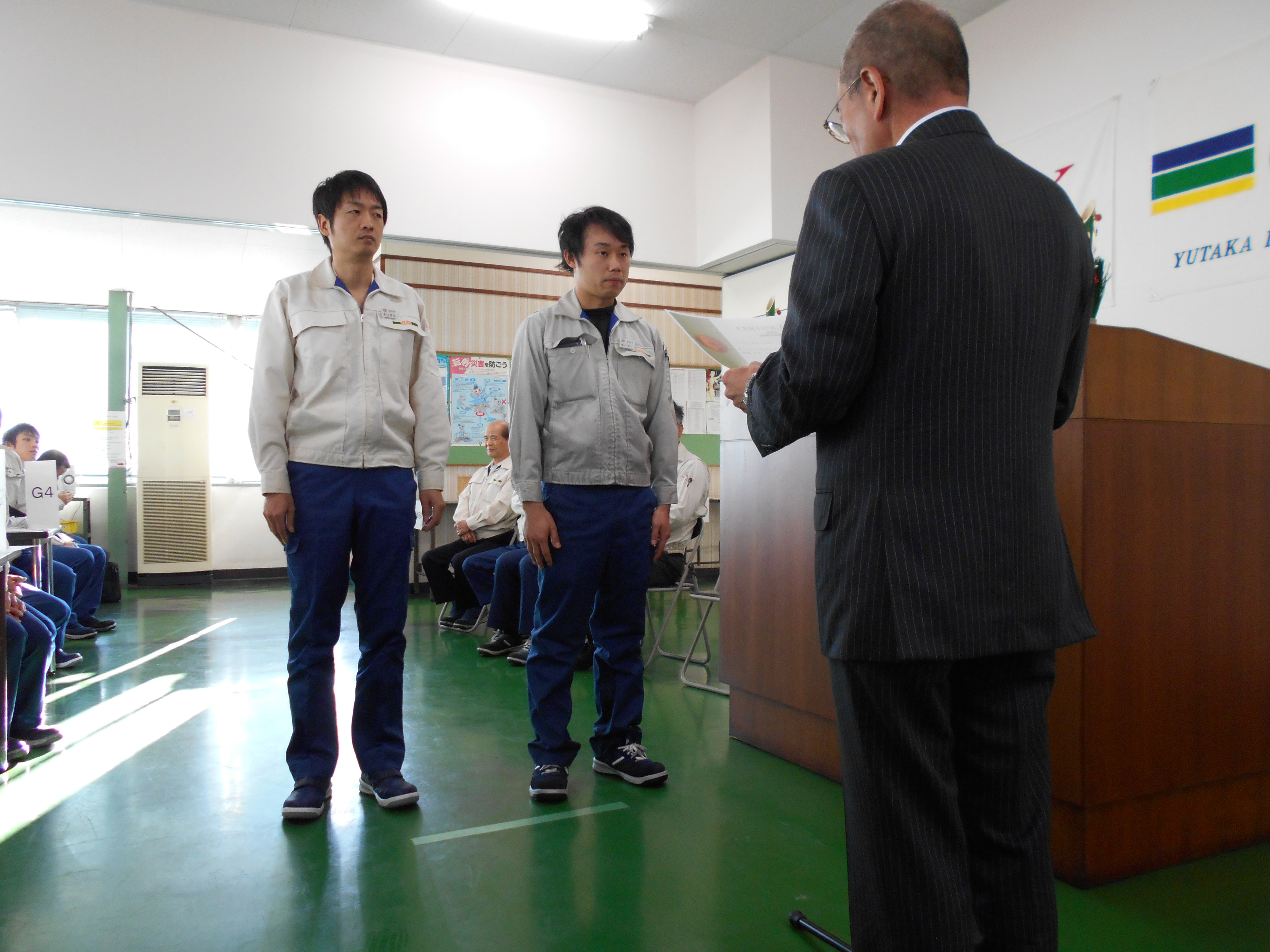 年初式では、定年到達者表彰、永年勤続感謝状贈呈、改善提案表彰、昨年11月に行われたデンソー飛翔会「仕入先技能競技大会」の表彰披露、デンソー殿からの感謝状紹介、TIE実践教育 認定書授与、国家資格取得者 氏名披露がありました。