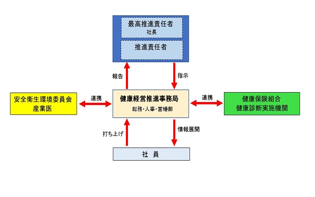 最高責任者を社長とし、健康経営推進事務局を中心として安全衛生環境委員会や産業医、