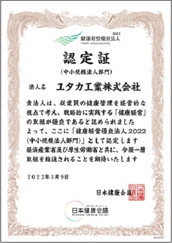 このたびユタカ工業は、経済産業省が認定している「健康経営優良法人認定制度」より、