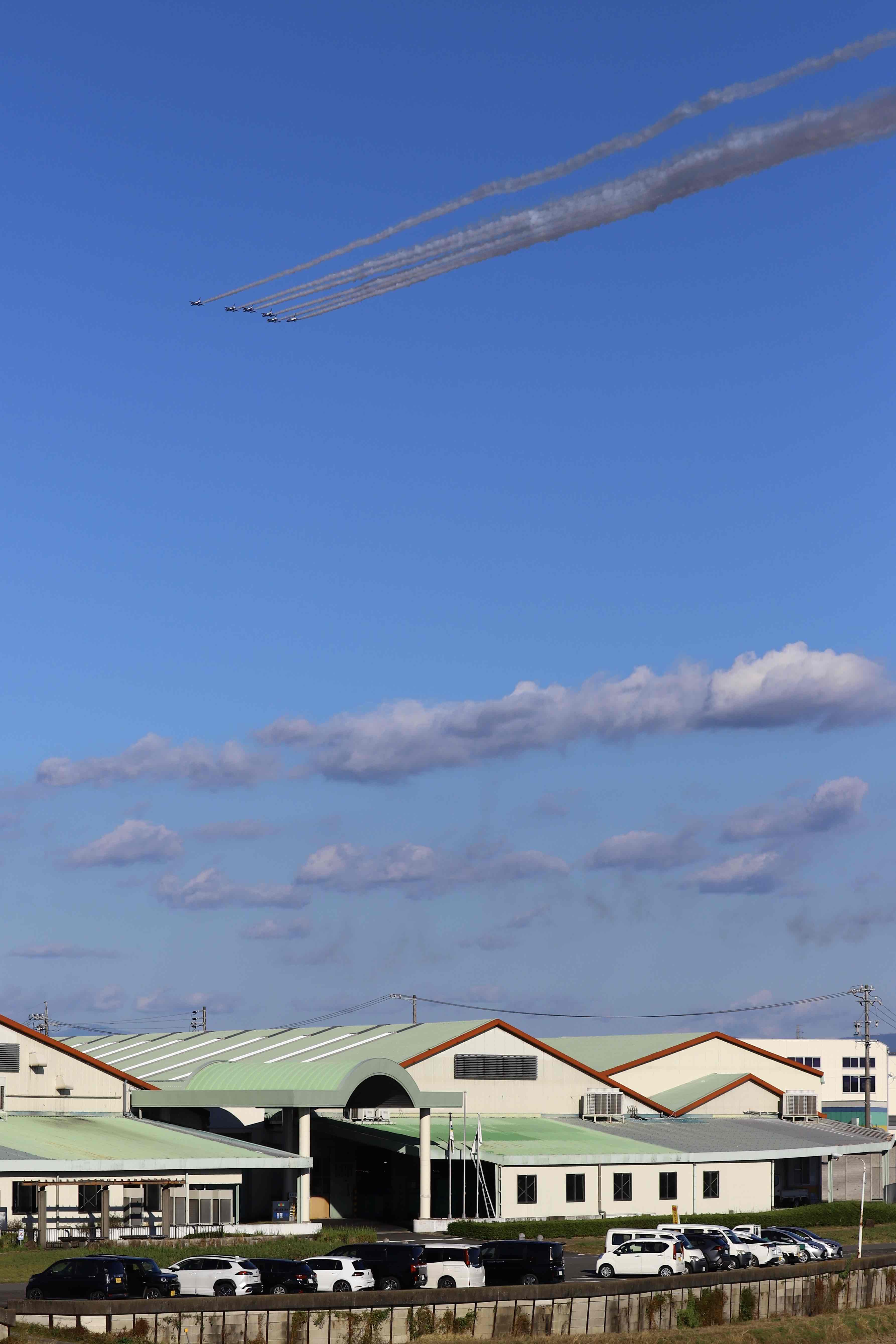 昨年2024年に開催された「世界ラリー選手権フォーラムエイト・ラリージャパン2024」のオープニングで、ブルーインパルスが飛行しました。従業員のWさんが、ユタカ工業上空を飛行するブルーインパルスの姿をカメラに収めてくれましたので、ご紹介させていただきます。