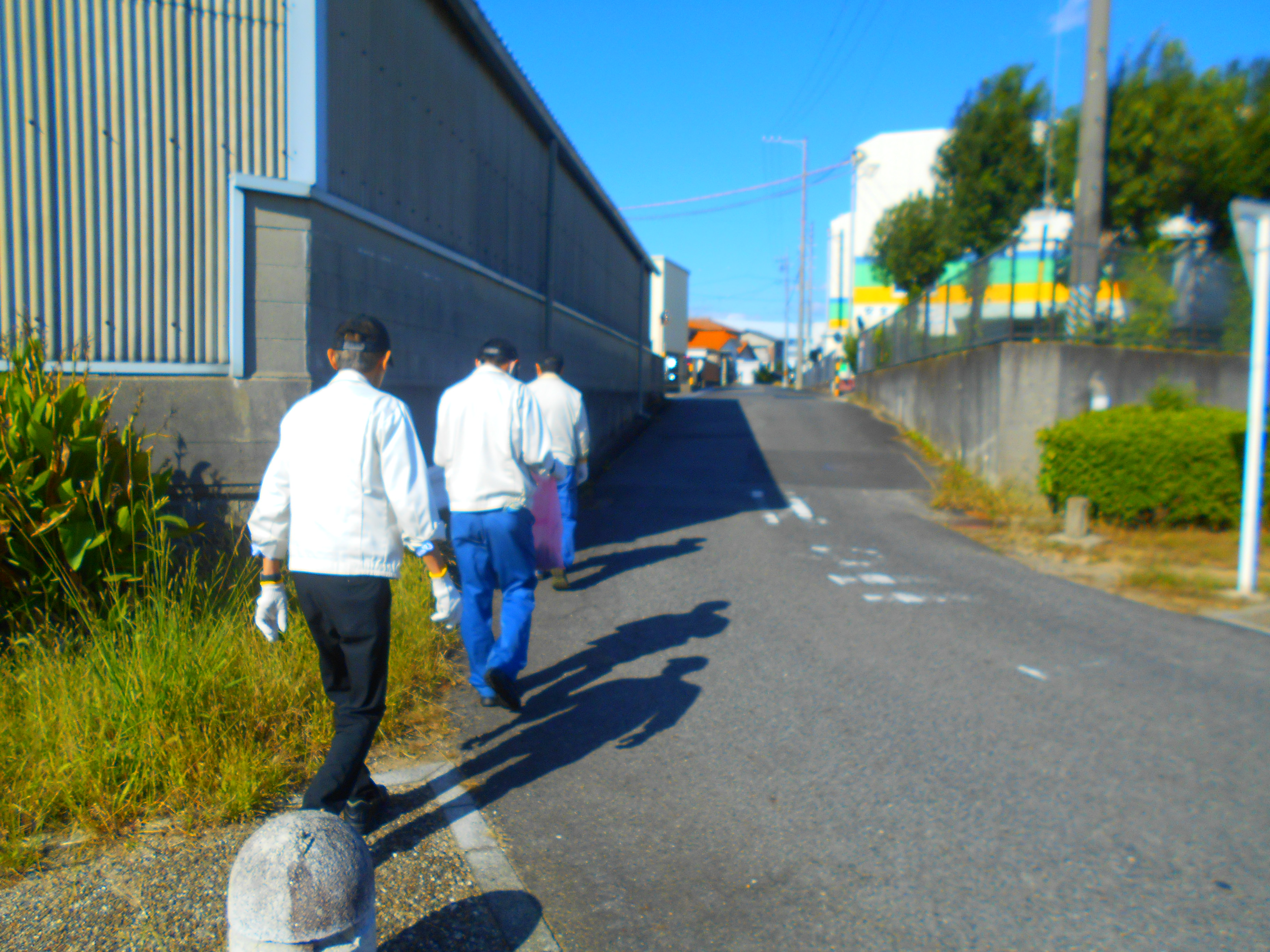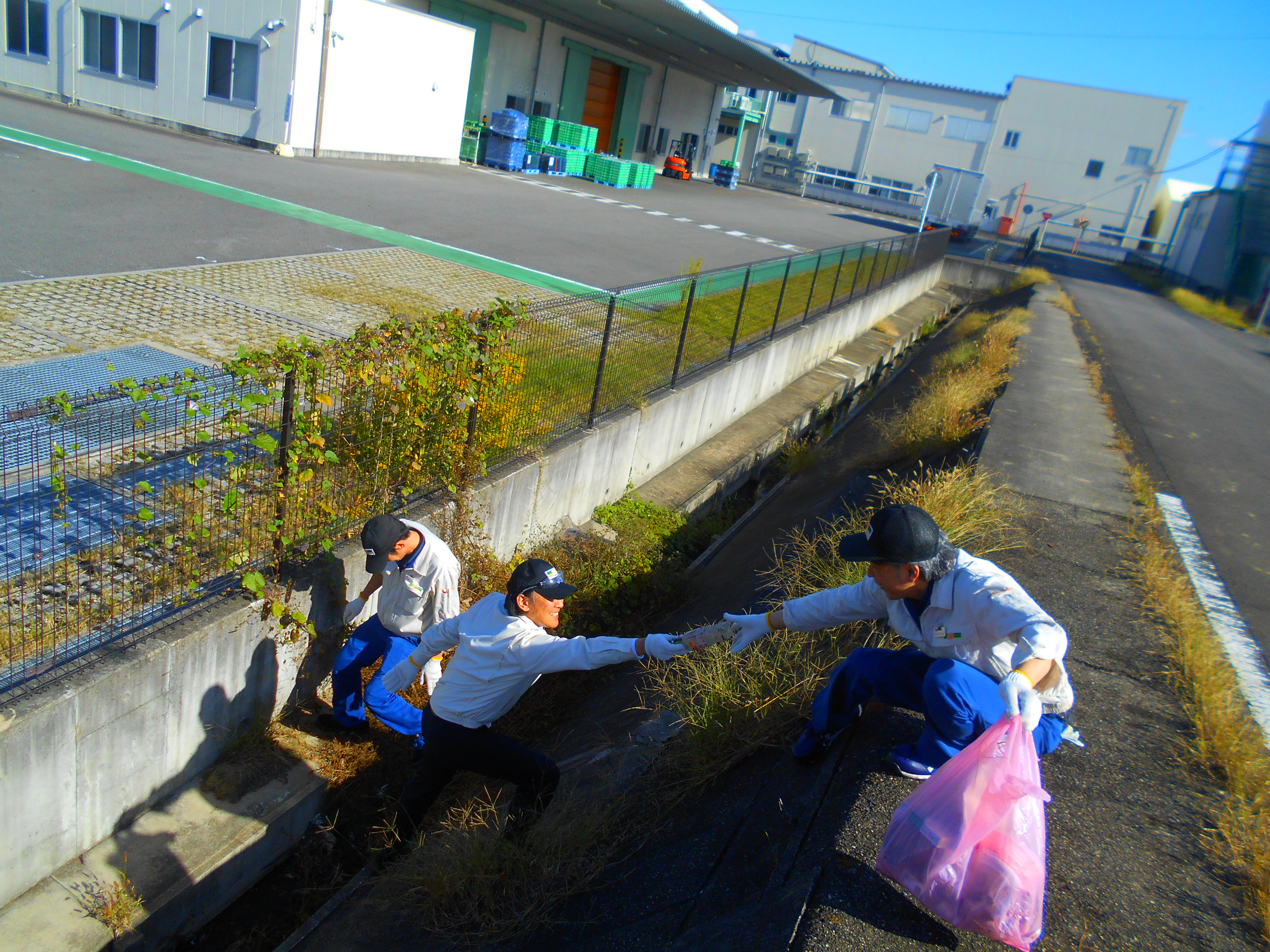 当日は、油が工場外に漏洩するのを防ぐ緊急事態対応訓練と、会社周辺の公道のゴミ拾いを行いました。